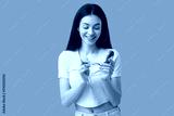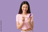 Beautiful young woman with makeup brush and highlighter on lilac background