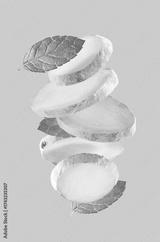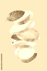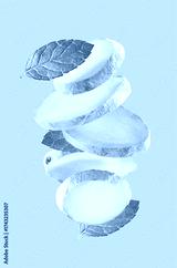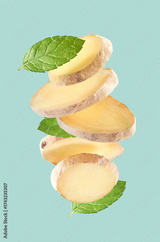 Falling ginger root and mint leaves in closeup on blue background