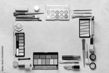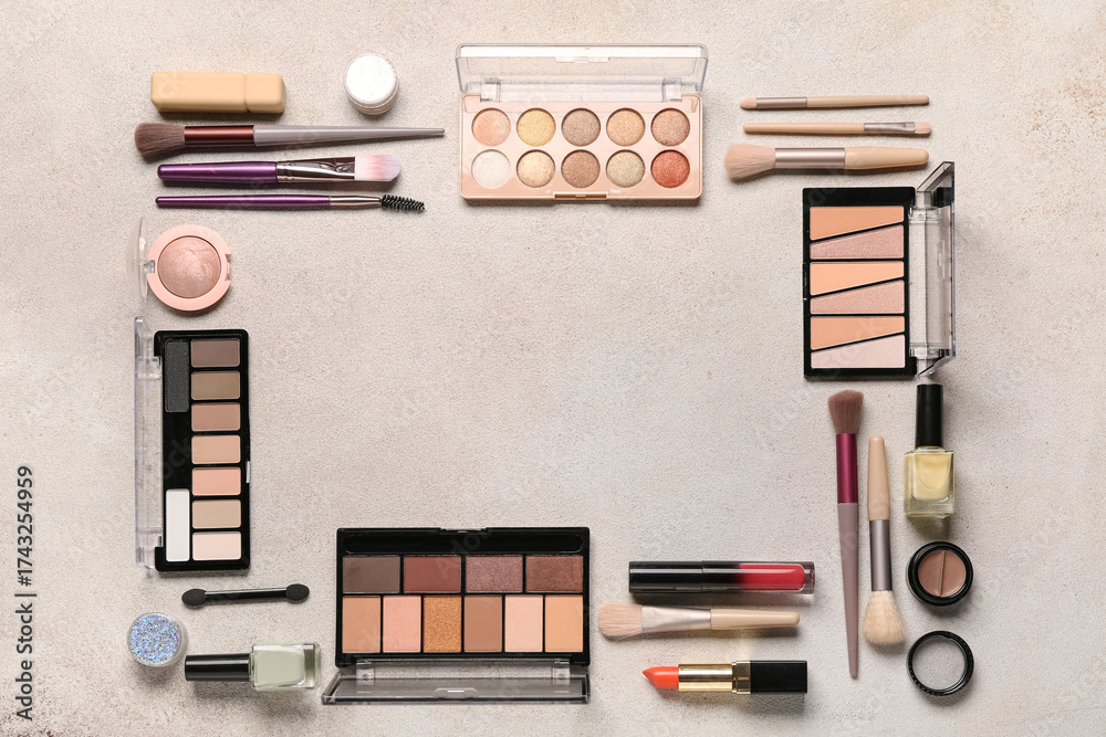 Frame made of makeup brushes and cosmetic products on beige grunge background