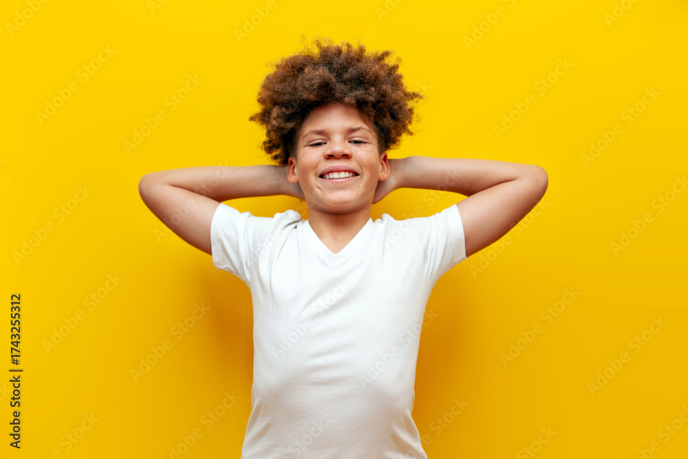 cheerful curly african american boy resting with hands behind head and lying on yellow isolated background, teenager in white t-shirt relaxing and smiling
