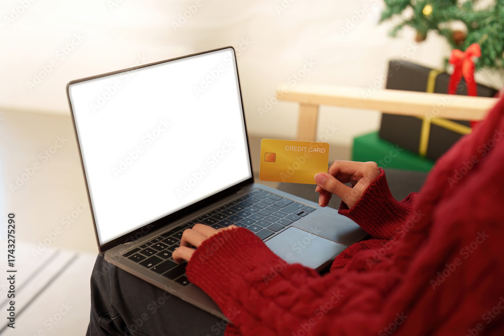 Online shopping for Christmas. Using credit card on laptop.