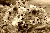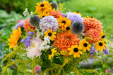 Summer bouquet. Beautiful orange, yellow and blue fresh flower arrangement. Birthday or weddding bouquet made of summer flowers.