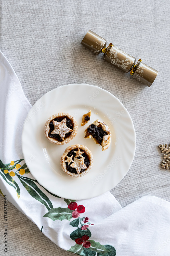 Festive mince pies with star pastry and a holiday cracker