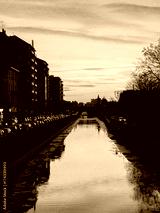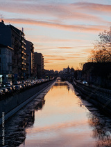 Sun Setting on a Canal in Milan Amidst Evening Traffic