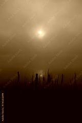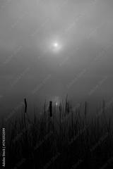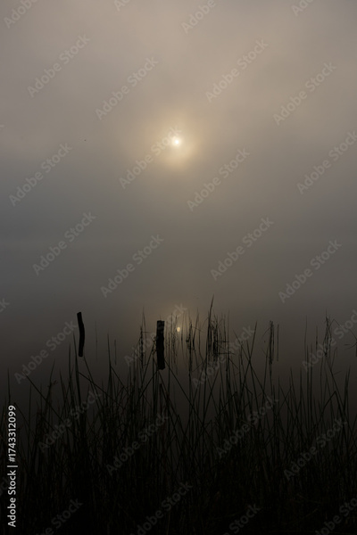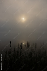 Sunrise over lake early foggy morning with tall grass
