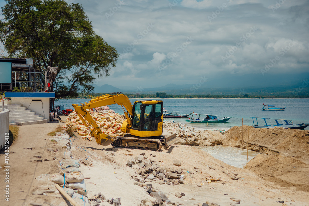 Beach Construction Site with Yellow Excavator, Gili Air