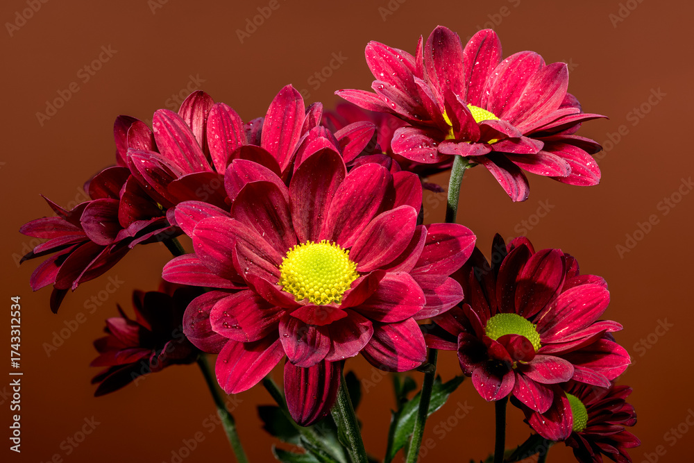 ush Bouquet of Red Chrysanthemums with Dewdrops on a Brown Background