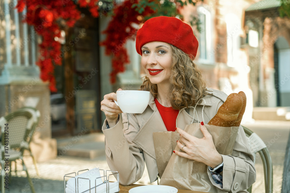 Woman in beret enjoys coffee and baguette outdoors