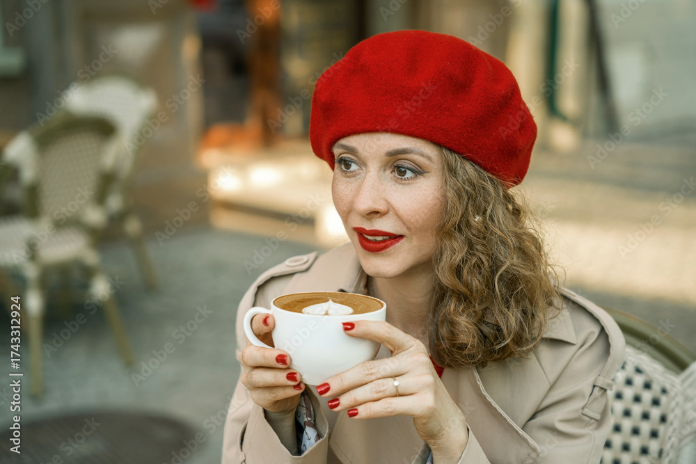 Woman in red beret enjoying coffee. Parisian cafe lifestyle.