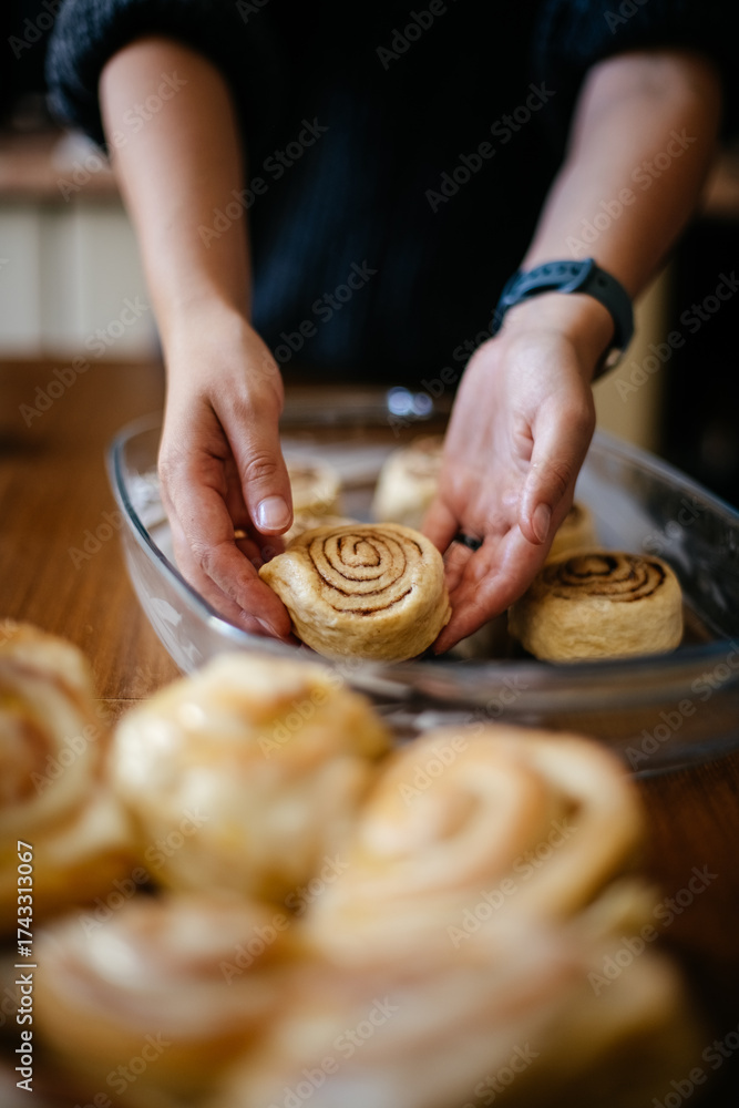 Placing cinnamon roll into glass dish