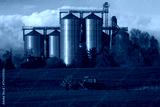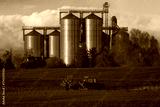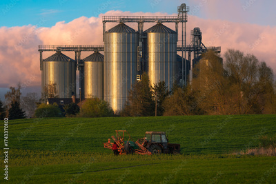 A rural landscape illustrating a tractor spraying a spring field against the backdrop of a grain elevator.