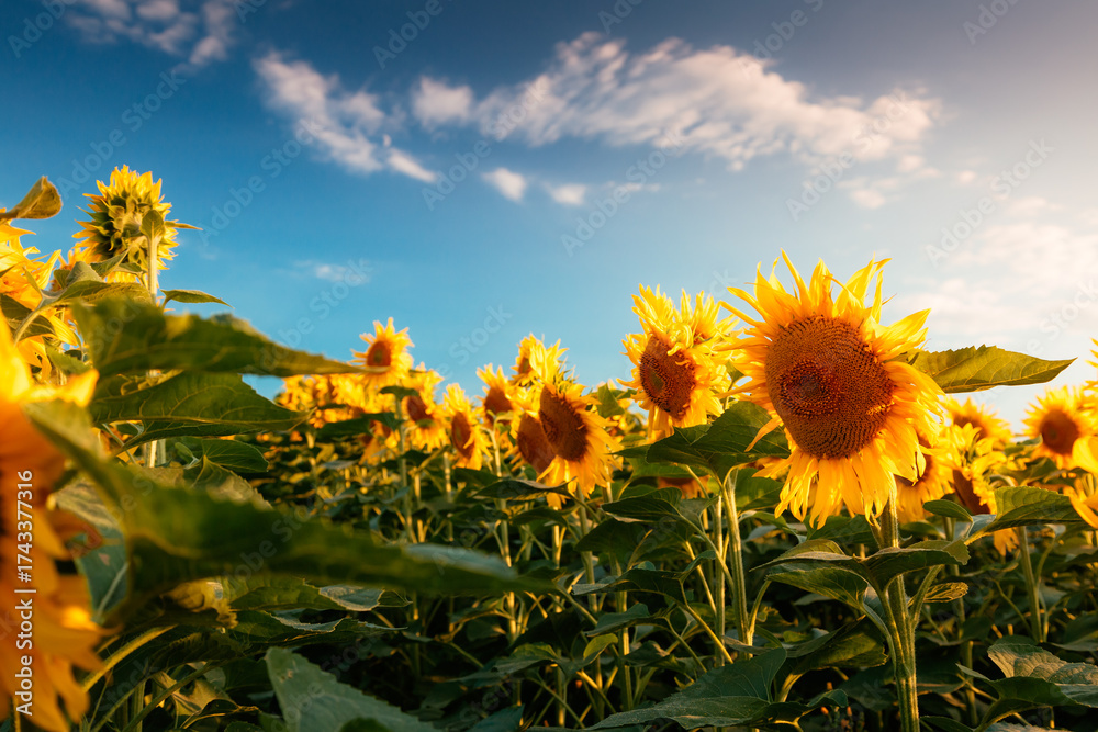 Close up vivid sunflowers bloom in a golden sunset in an expansive rural field. Ukraine agrarian region, Europe.