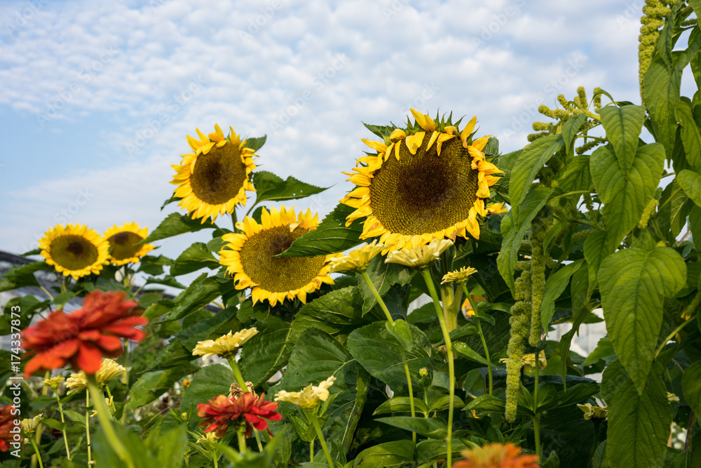 sunflowers in garden with front view of small red flowers happy summer mood