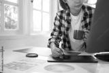 Designer working on creative project with color wheel, sketches, and computer