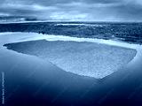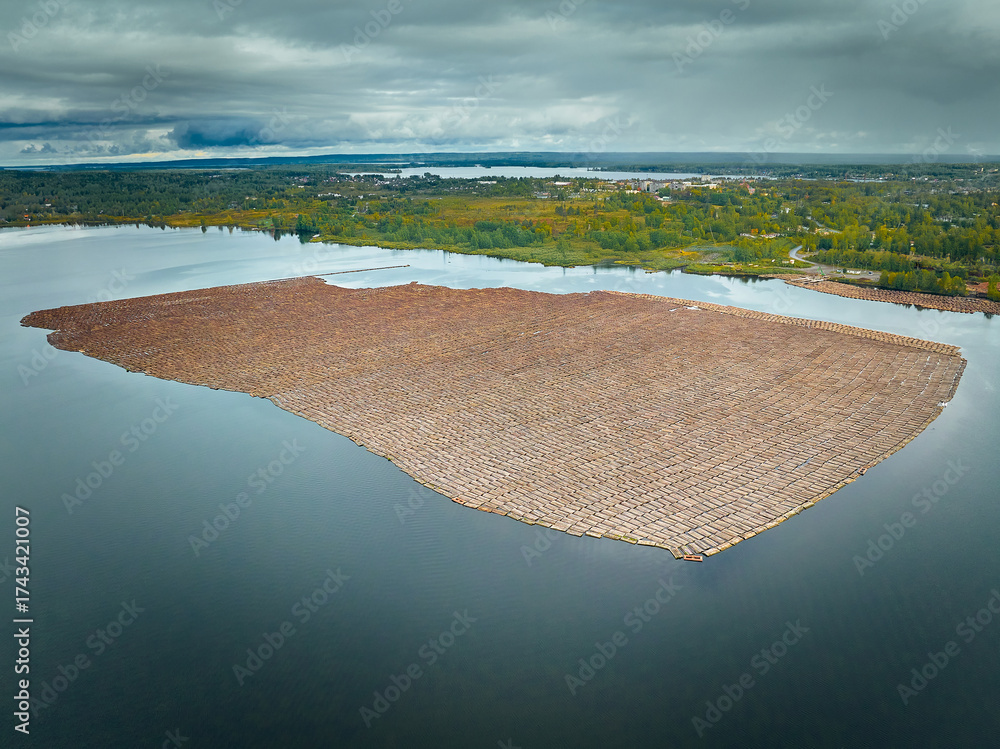 Water log storage facility in a serene landscape with calm waters and green surroundings