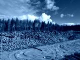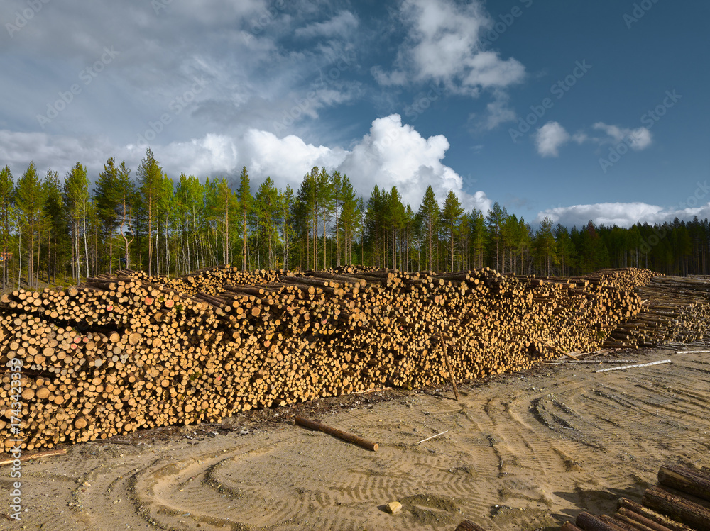 Temporary timber storage site with stacked logs surrounded by forested area under a clear blue sky