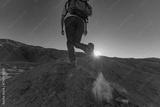 A man in bright clothes with a backpack on his back is walking up a dusty mountain during the golden hour, with a view of the setting sun. Demonstration of a shoe sole at sunset. A man at sunset.
