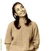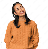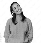 Young Filipina woman relaxed and happy laughing, neck stretched showing teeth.