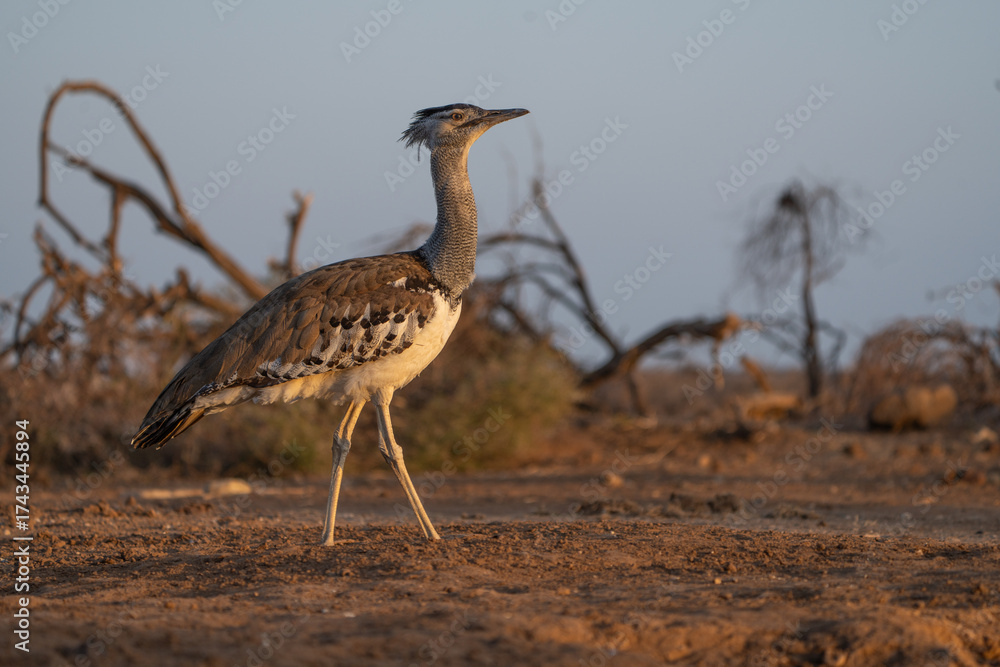 A kori bustard walking over the arid soil before sunrise, looking to the side, Botswana.