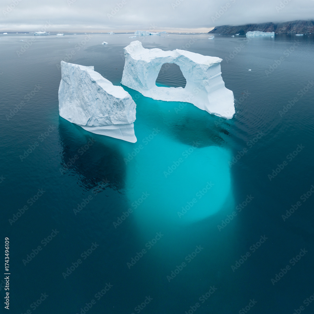 defaultHuge icebergs floating in the sea in a fjord off the coast of Greenland. Floating icebergs, global warming, and climate change. Aerial view of the ice. Summer time, popular tourist destination.