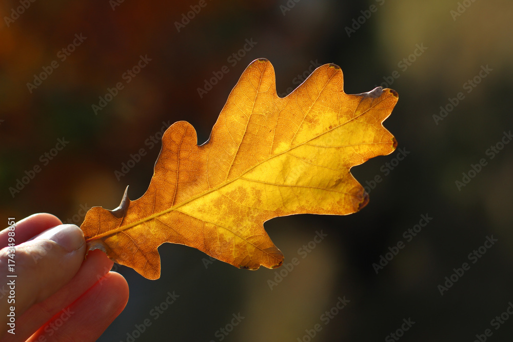Woman's fingers hold a bright yellow and brown oak leaf on a natural blurred background