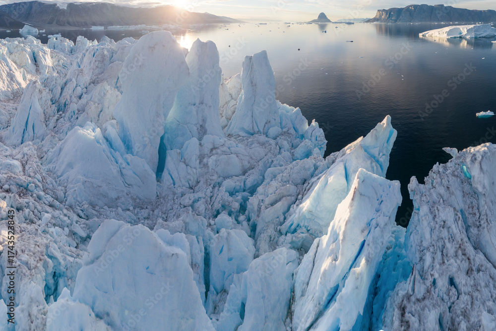 defaultHuge icebergs floating in the sea in a fjord off the coast of Greenland. Floating icebergs, global warming, and climate change. Aerial view of the ice. Summer time, popular tourist destination.