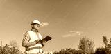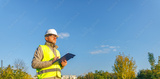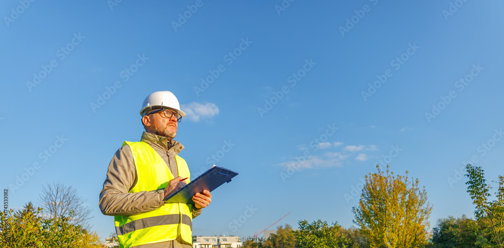 Male engineer inspects the condition of a new construction site. Work forestry inspector, environmental control. Ecologist conducts environmental monitoring soil analysis.