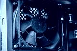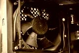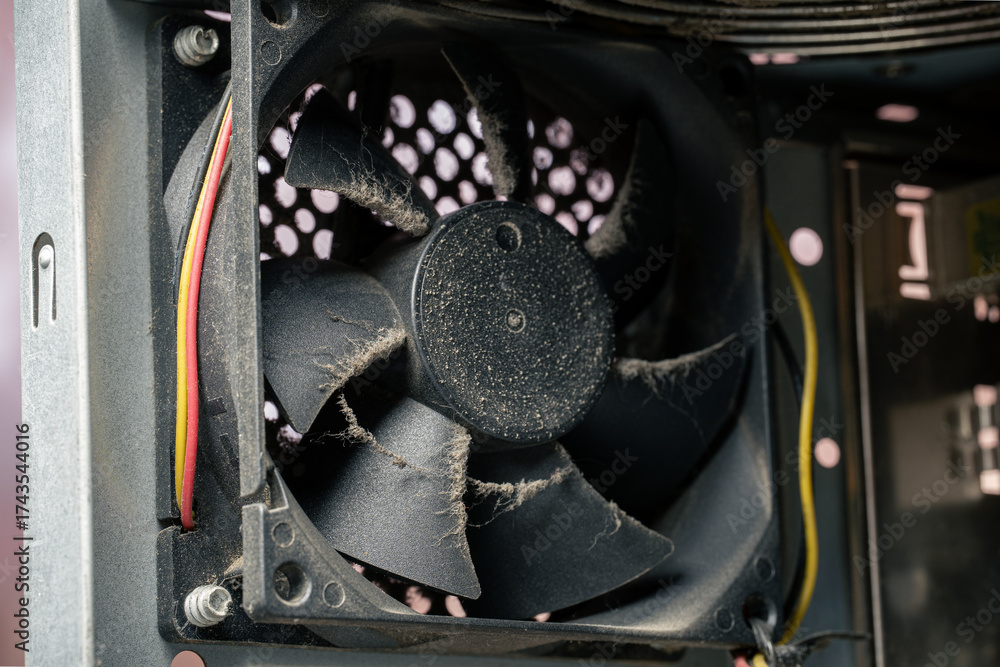 Close-up of a dusty computer case cooling fan inside an old PC, dirty hardware with dust buildup on blades, concept of computer maintenance and overheating problem