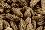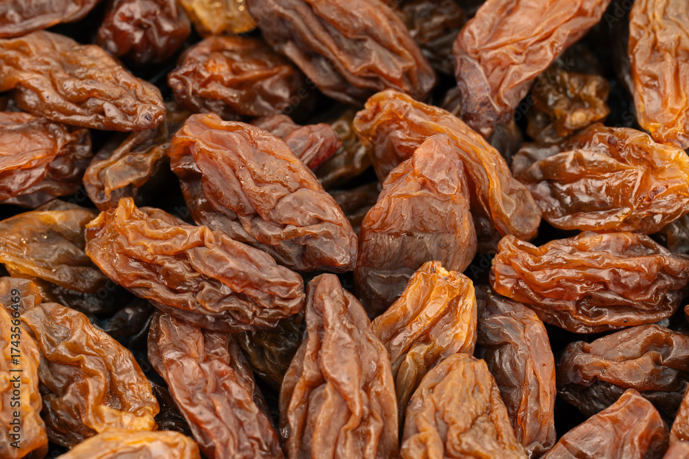 Raisins on a white background. Dried grapes. Background of light-colored raisins.
