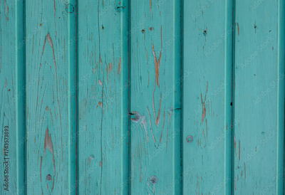 A fence made of vertical wooden planks of green color in close-up.
