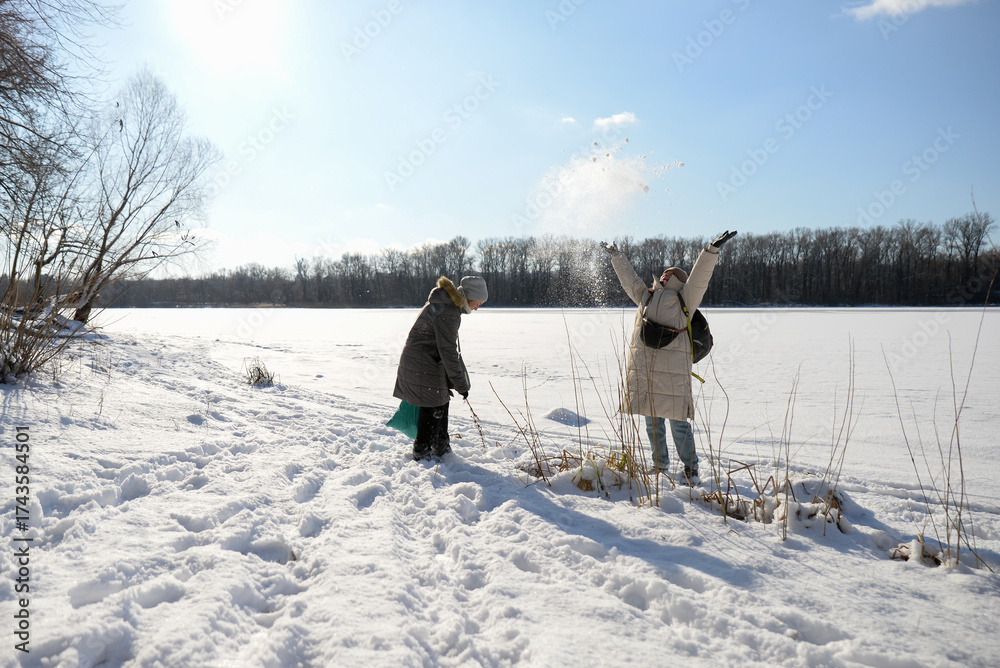 two women girlfriends throw snow, play snowballs in winter park against the backdrop of snowy views