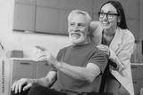 Caregiver assisting senior man in wheelchair pointing finger, looking away