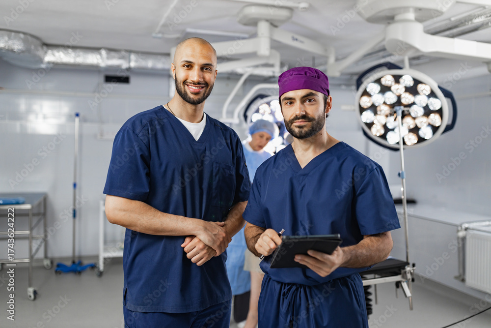 Two surgeons pose in an operating room, with surgical lights and equipment visible in the background, ready for a procedure.