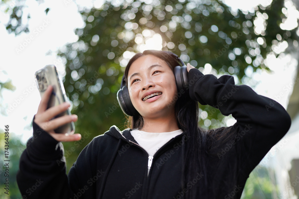Happy Gen Z girl listening to music on wireless headphones, relaxing on a park. Smiling teen using smartphone for streaming. Youth lifestyle, leisure, and technology concept.