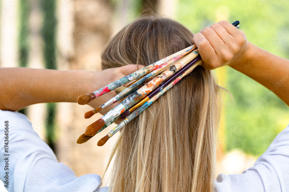 Rear view of a woman gathering colorful, paint-splattered brushes behind her head, long blonde hair and soft bokeh, artistic lifestyle and creativity concept