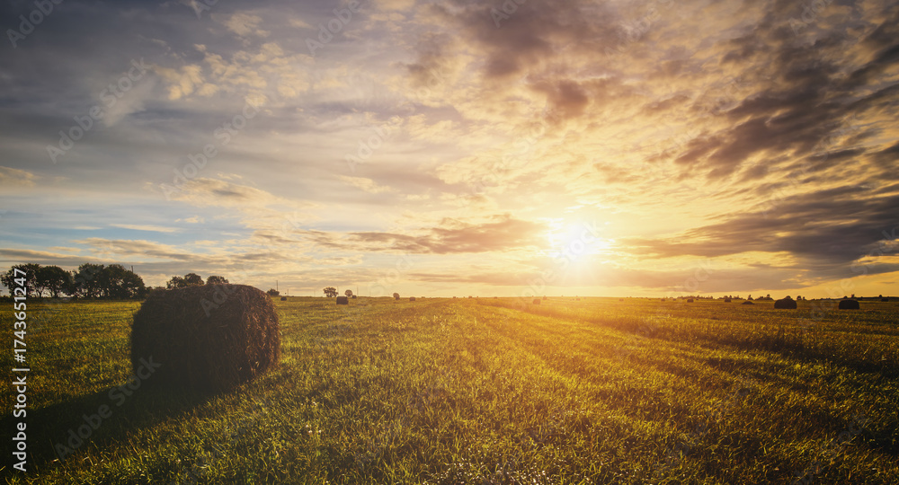 Sunset over hay bales in a field. Golden light bathes the landscape, creating a tranquil scene. For agriculture, travel and inspiring greeting card designs. Vintage film aesthetic.