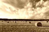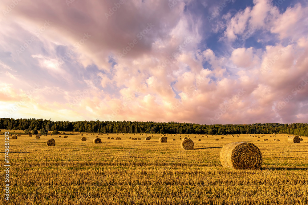 Haystack bale on a golden field landscape at sunset. Rural agricultural scene with bales of hay. Countryside harvest concept.