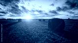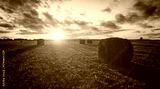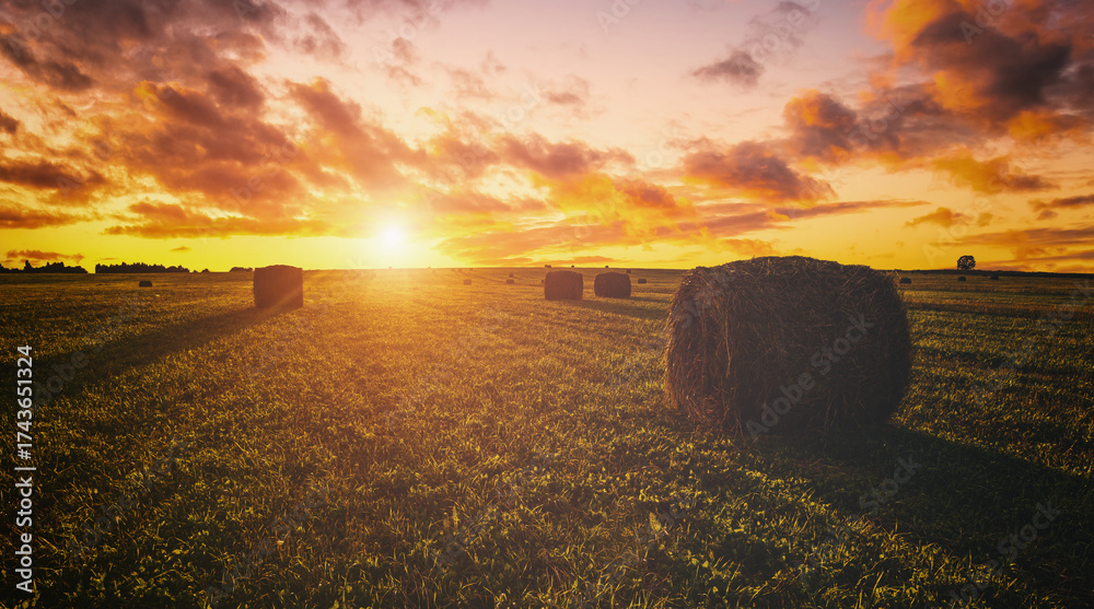 Sunset over hay bales in a field. Golden light bathes the landscape, creating a tranquil scene. For agriculture, travel and inspiring greeting card designs. Vintage film aesthetic.