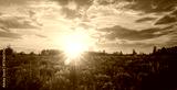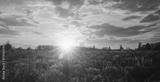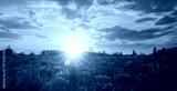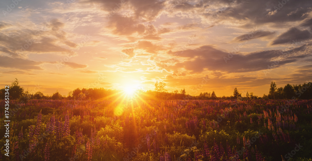 Summer landscape with purple wild flower lupine field and bright sunrise or sunset sky. Nature scenic backdrop for calm, peace, and serenity concept. Vintage film aesthetic.