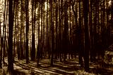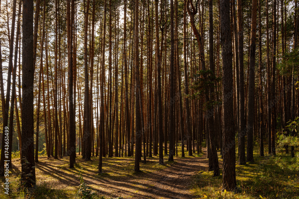 Green moss and grass on a ground in tall pine forest with hiking trail. An outdoor nature trail surrounded by natural beauty. The sun shines through pine trunks. Natural scenic for wallpaper design.