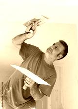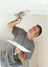 Man in grey work t-shirt uses trowel and hawk to plaster ceiling, construction or renovation of house