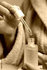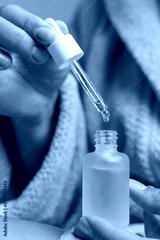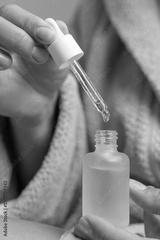 Closeup of woman in pink bathrobe opening cosmetic glass dropper bottle and holding pipette