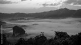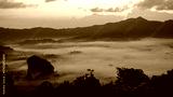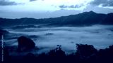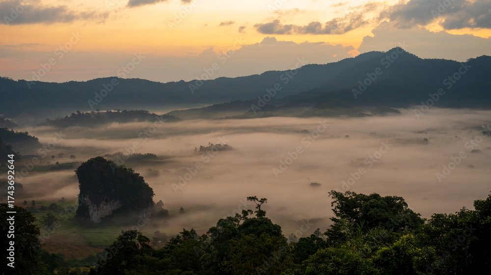 Dramatic sunset over mountain landscape. Beautiful landscape foggy hills twilight time. Blue golden sky sunrise dramatic beautiful landscape mountain. Dawn sky gold dusk time cloudscape with sunlight