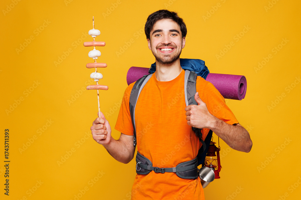 Young traveler man carry backpack stuff mat eat roasted sausages on stick isolated on plain yellow background. Tourist leads active lifestyle walk on spare time. Hiking trek rest travel trip concept.