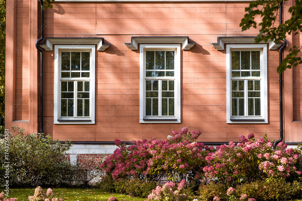 Streets of the city of Vidnoye near Moscow. Beautiful autumn estate with hydrangeas on a sunny autumn day. City park landscape.