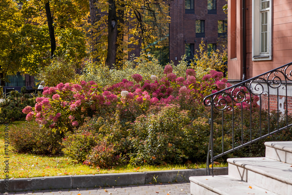 Streets of the city of Vidnoye near Moscow. Beautiful autumn estate with hydrangeas on a sunny autumn day. City park landscape.