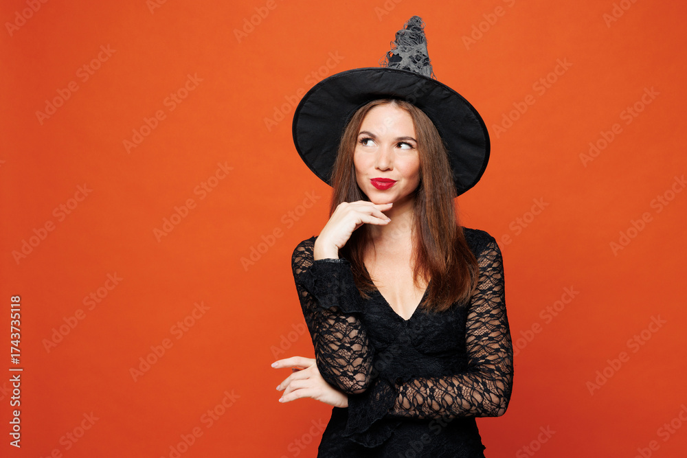 Young pensive woman wears black hat dress witch costume put hand prop up on chin, lost in thought isolated on plain red orange background studio portrait. Celebration Halloween holiday party concept.