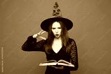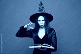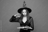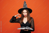 Young wicked woman she wears black hat dress witch costume hold and magic book casting dark spell isolated on plain red orange background studio portrait. Celebration Halloween holiday party concept.