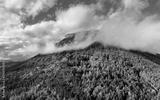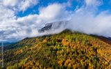Aerial view of Ceuze mountain in the region of Gap, Hautes Alpes. Autumn forest with colorful foliage covering the slopes and scenic alpine wilderness of the French Alps. France