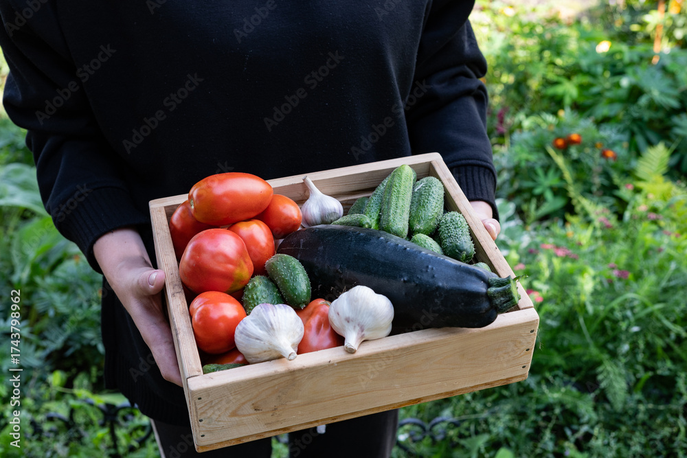 Freshly harvested vegetables including cucumbers, tomatoes, and garlic in a wooden crate surrounded by grass in a garden setting
